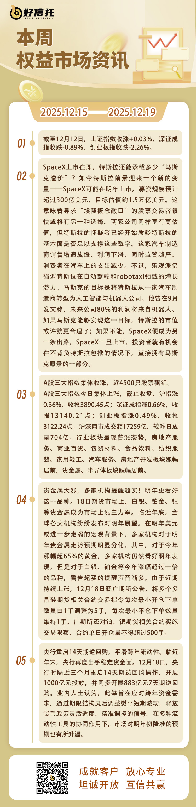 1、人民银行:将在香港招标发行400亿元人民币央票。12月18日,中国人民银行官网公告称,为丰富香港高信用等级人民币金融产品,完善香港人民币收益率曲线,根据中国人民银行与香港金融管理局签署的《关于使用债务工具中央结算系统发行中国人民银行票据的合作备忘录》,2025年12月22日(周一)中国人民银行将通过香港金融管理局债务工具中央结算系统(CMU)债券投标平台,招标发行2025年第十期中央银行票据。第十期中央银行票据期限6个月(182天),为固定利率附息债券,到期还本付息,发行量为人民币400亿元,起息日为2025年12月24日,到期日为2026年6月24日,到期日遇节假日顺延。第十期中央银行票据面值为人民币100元,采用荷兰式招标方式发行,招标标的为利率。