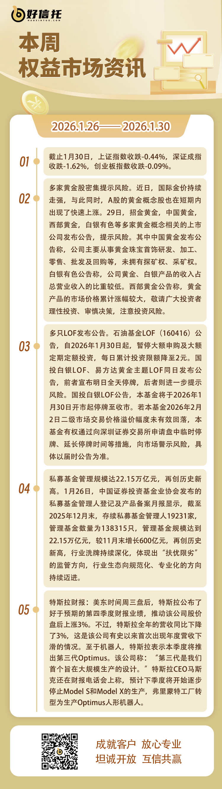 3、上市券商2025年业绩集体预喜。近期,多家上市券商2025年业绩集体预喜。1月27日晚间,已有国泰海通、申万宏源、东方证券、红塔证券、招商证券同步发布了2025年业绩预告或快报,这5家券商全年归母净利润同比分别增长111%~115%、74.64%~93.83%、67.8%、59.05%、18.43%。此前,中信证券、国联民生等5家券商率先披露了业绩预告或快报,亦交出亮眼成绩单,预计2025年上市券商整体净利润同比增幅将达到四成至六成。