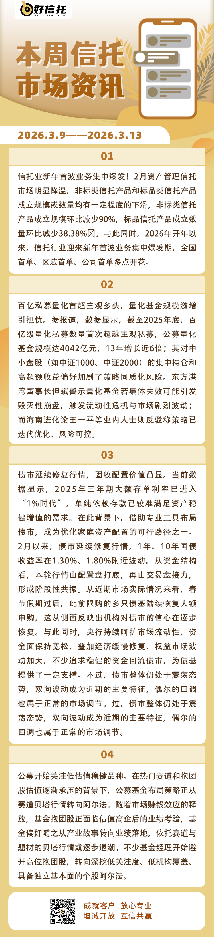 1、科创债ETF企稳回暖。所谓债券型ETF,是指跟踪不同债券指数的交易型开放式基金。公开数据显示,截至2026年3月9日,科创债ETF市场整体保持了较高活跃度,呈现出净值连涨、规模企稳、交易回暖三大特征,且资金持续向高信用等级、高流动性标的集中。在2026年债市波动加剧的情况下,于防御方面,其高等级信用债的底色将为投资者提供稳定票息;于进攻性上,考虑到科技发展如火如荼,该行业将持续提供红利价值,也为科创债带来一定的收益弹性。随着科创债利好政策的持续加码,以及发行机制的不断优化,在管理层态度坚定引导资金投向硬科技领域的大背景下,科创债ETF市场的底层资产表现有望获得坚实支撑。